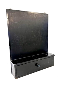 Svartmáluð viðarhilla með skúffu. Bakið er krítartafla og í skúffunni eru krítar.