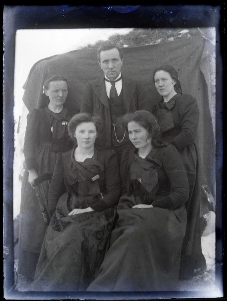 Aftari röð f.v.: Helga Finnsdóttir, Sigurður Finnsson, óþekkt kona; Fremri röð f.v.: óþekkt kona, óþekkt kona.