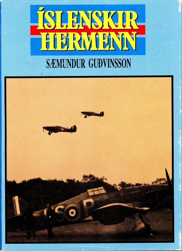 Íslenskir hermenn segja frá stríðsreynslu sinni í máli og myndum. Bókiin er blá með mynd af herflugvélum á forsíðu.
