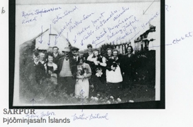 Heimilisfólk og gestir við Ytri-Kárastaði. F.v.: Sveinn Þórðarson, Bjarni Stefánsson, Guðrún Sveinsdóttir, Óþekktur karl, Þórður Sæmundsson, Hrólfur Þorsteinsson, Guðbrandur Guðbrandsson, Þuríður Jórunn Þórðardóttir (með blóm), Davíð Þorgrímsson, Þórðveig Jósefsdóttir, Valgerður Þorsteinsdóttir, Hansína Þorsteinsdóttir, Óþekkt kona.