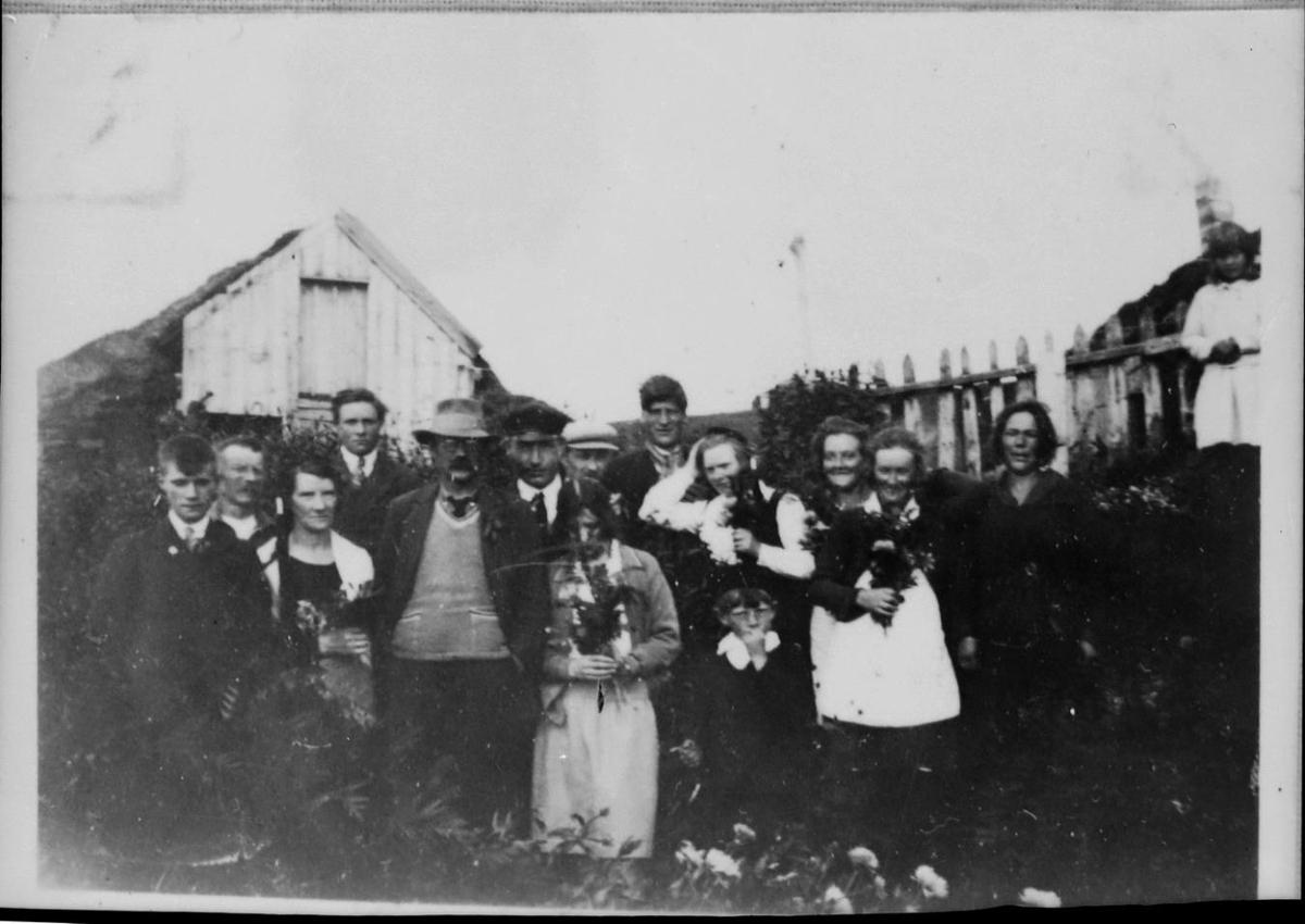 Heimilisfólk og gestir við Ytri-Kárastaði. F.v.: Sveinn Þórðarson, Bjarni Stefánsson, Guðrún Sveinsdóttir, Óþekktur karl, Þórður Sæmundsson, Hrólfur Þorsteinsson, Guðbrandur Guðbrandsson, Þuríður Jórunn Þórðardóttir (með blóm), Davíð Þorgrímsson, Þórðveig Jósefsdóttir, Valgerður Þorsteinsdóttir, Hansína Þorsteinsdóttir, Óþekkt kona.