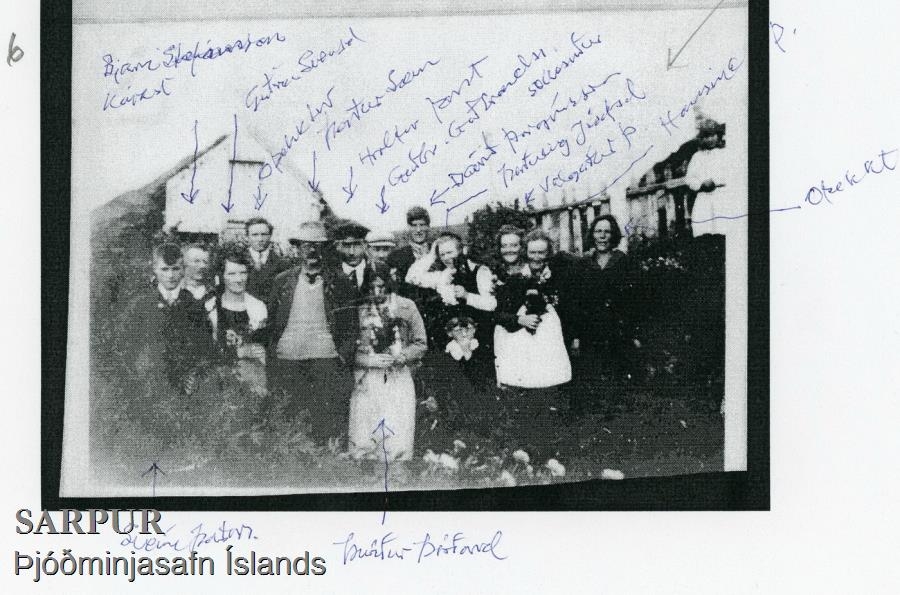 Þór Magnússon hefur greint myndina:" Á Ytri-Kárastöðum á Vatnsnesi. -Frá vinstri: Sveinn H. Þórðarson (móðurbróðir minn, Þ. M.), Bjarni Sveinsson lausamaður á Kárastöðum, Guðrún K. Sveinsdóttir (amma mín, Þ. M.), maðurinn aftan við óþekktur, Þórður Sæmundsson maður Guðrúnar (afi minn, Þ. M.), Hrólfur J. Þorsteinsson frá Gröf ( fósturfaðir minn, Þ. M.), aftan við hana Guðbrandur Guðbrandsson skósmiður (held ég örugglega, hann var á skóverkstæði afa míns), Davíð Þorgrímsson bóndi á Ytri-Kárastöðum, Þórðveig Jósefsdóttir (ath. hún hét Þórðveig), kona Davíðs, heldur um höfuð sér, Valgerður Þorsteinsdóttir frá GRöf, systir Hrólfs, Hansína Þorsteinsdóttir frá Gröf , systir Valgerðar og Hrólfs.-Konuna lengst til hægri þekki ég ekki, heldur ekki drenginn fremst, gæti verið annað hvort Ingólfur Guðnason eða Leifur Blumenstein, sem aldir voru upp hjá Davíð og Þórðveigu.