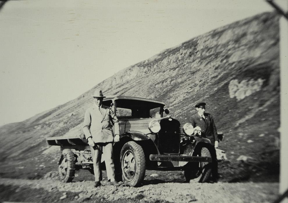 Á myndinni hafa tveir karlmenn stillt sér upp sitt hvoru megin við vörubifreið, Ford árgerð 1931. Klettabelti í baksýn. Sæmundur Skarphéðinsson t.v. og Jóhannes Davíðsson t.h.