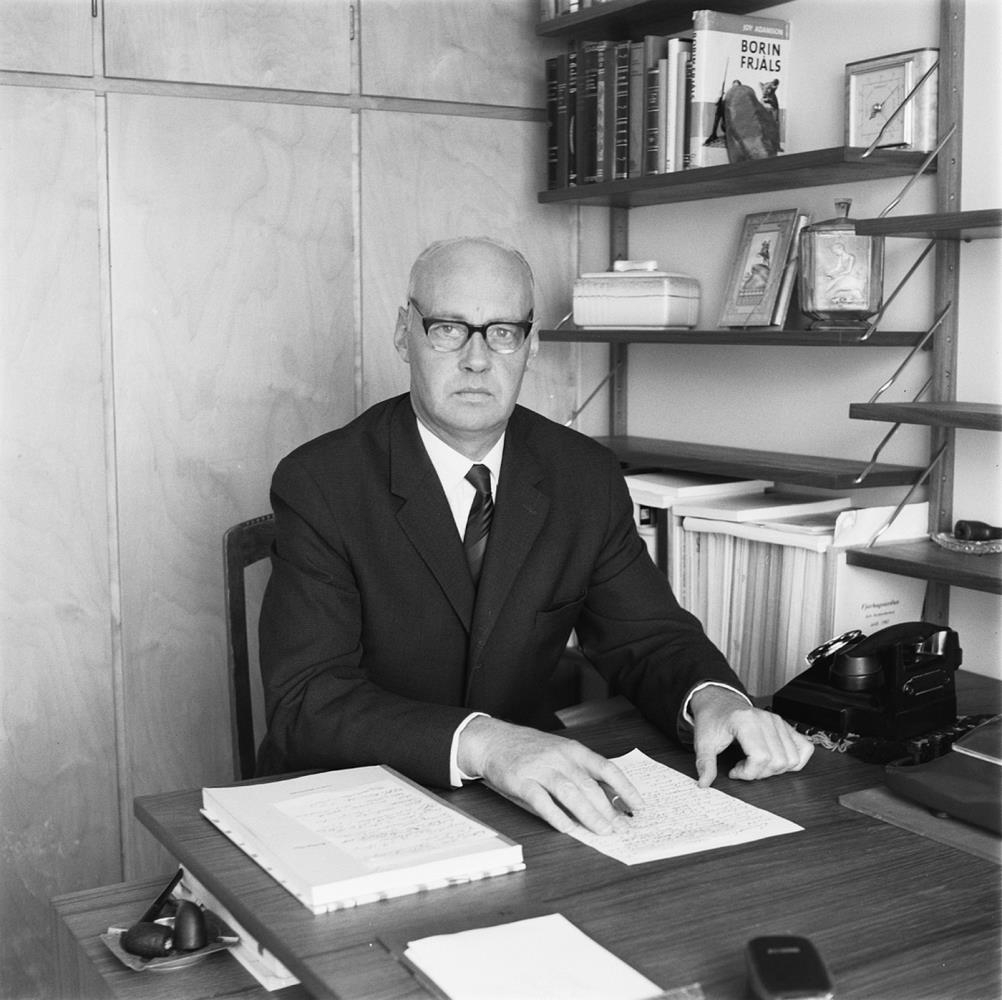 Guðmundur situr við skrifborð og heldur á penna. Á borðinu er meðal annars sími, mappa og blað. Fyrir aftan hann til hægri má sjá hillur með bókum, klukku og ýmsum skrautmunum.