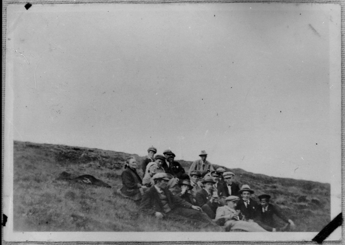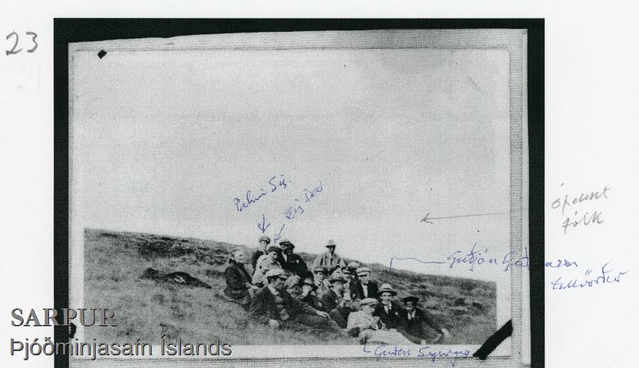Þór Magnússon hefur greint myndina:"Fólk í skemmtiferð, en ég þekki fátt.-Annar frá vinstri fremst er Guðjón Guðnason þá starfsmaður Kaupfélagsins (bróðir séra Jóns Guðnasonar og séra Einars í Reykholti og Jóhönnu konu Guðmundar á Óspaksstöðum, hann var síðar tollvörður í Reykjavík). Ofan við hann er Sigurður Davíðsson kaupmaður, með derhúfu, lengra til hægri er Sæmundur Skarphéðinsson smiður frá Kollsá, með háan hatt, fremst hægra megin er Sveinn H.Þórðarson móðurbróðir minn (Þ.M.), með dökka húfu.-Ég gæti trúað að konan lengst til vinstri sé Ingibjörg Sigurðardóttir, móðir þeirra Sigurður og Jóa, og líklegast ein dóttir hennar milli hennar og Sigurðar, en er ekki viss."
