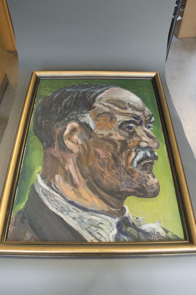 Kjarvalsmálverk af Eyjólfi Eyjólfssyni á Hnausum, föður gefanda, árið 1947. Merkt: JóhSKjarval ´47. Þetta er olíumálverk á striga og striginn saumaður saman ofarlega á malverki. Stærð með ramma 83 x 62 cm. Eyjólfur sat fyrir í vinnustofu Kjarvals. Gefið af Vilhjálmi Eyjólfssyni bónda á Hnausum í Meðallandi. Vilhjálmur hitti Kjarval ári síðar í Reykjavík og meistarinn spurði: "Hvernig líst þeim á málverkið af föður þínum þar eystra? "Þeim finnst það stórfenglegt", sagði Vilhjálmur. "Það á líka að vera það" svaraði Kjarval.
