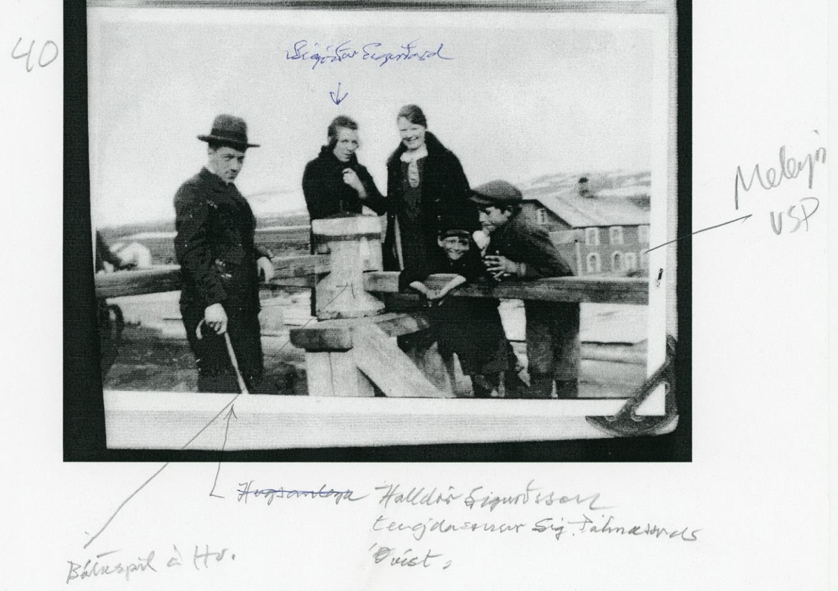 Þór Magnússon hefur greint myndina: „Halldór Sigurðsson, síðar sparisjóðsstjóri í Borgarnesi, vann við Kaupfélagið á Hvammstanga, Sigríður Sigurðardóttir kona hans, dóttir Sigurðar Pálmasonar kaupmanns, konan til hægri sennilega Benný Sigurðardóttir en drengirnir óþekktir. Myndin er tekin við bátaspilið á Hvammstanga, hús Sigurðar Pálmasonar í baksýn til hægri.“
