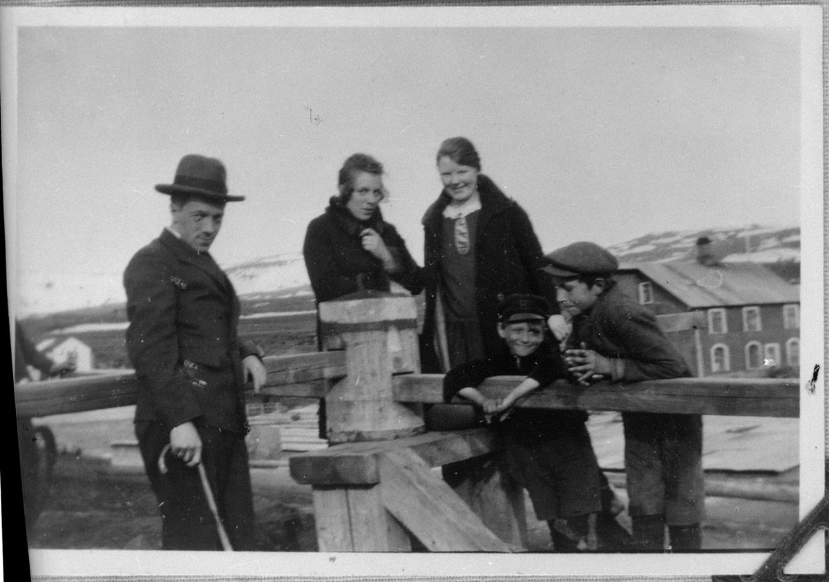 Til vinstri er karlmaður með hatt, þar næst tvær konur og svo tveir drengir. Þau standa við bátsspil. Í baksýn til hægri má sjá hús.