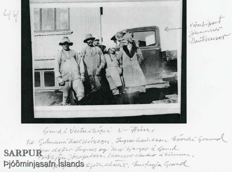 „Grund í Vesturhópi V-Hún. Vörubifreið Jóhannesar Davíðssonar og við hana standa f.v.: Guðmann Halldórsson, Ingvar Sveinsson bóndi Grund, tvær dætur Ingvars og Ingibjargar á Grund, Friðbjörn Jósafatsson (drengur stendur á bílnum). Ingibjörg Sigurbjörnsdóttir, húsfreyja Grund.“ (Þór Magnússon)