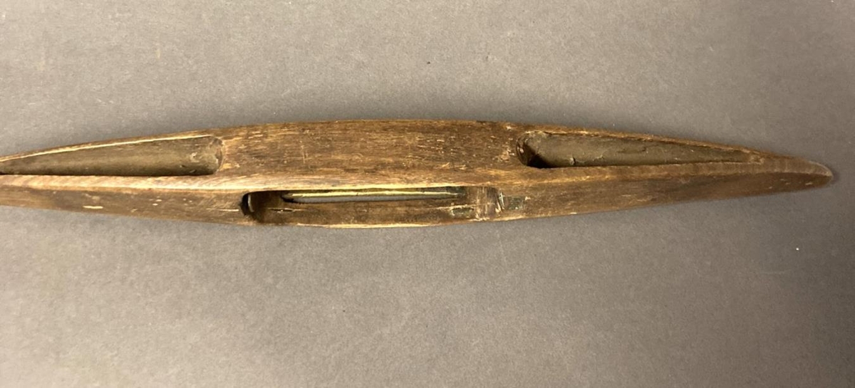 Vefskytta, 36,5 cm. á lengd. Aflöng göt skorin í báða enda til að gera hana léttari í verki. Gefandi Vilhjálmur Eyjólfsson á Hnausum.