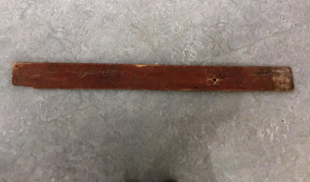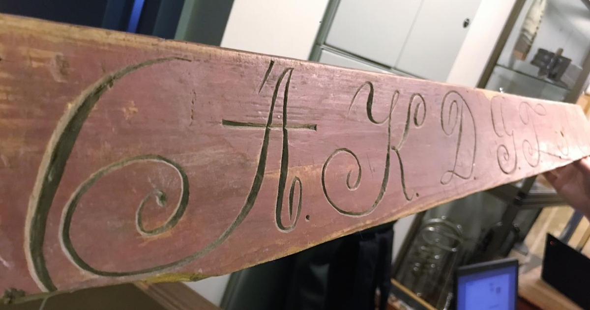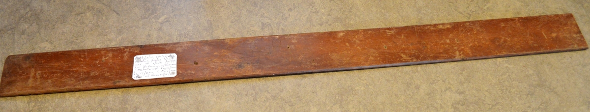 Púkkfjöl, skorin af föður gefanda árið 1903. Hann þá 14 ára. Er með merkingum fyrir púkkspil, A.K.D.G.F.P. Einstæður gripur. Gefið af Vilhjálmi Eyjólfssyni á Hnausum.