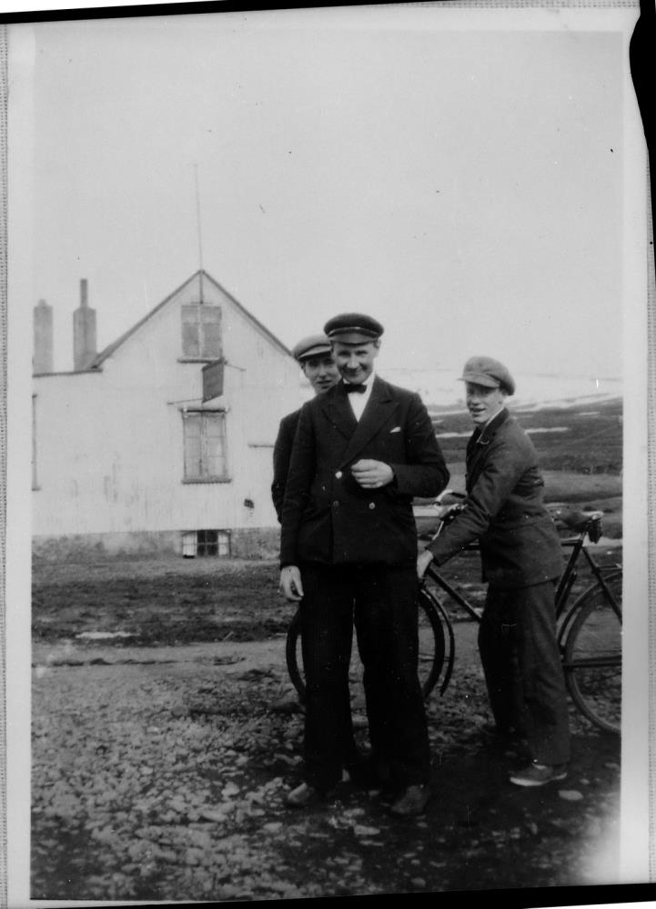 Þrír ungir karlmenn fremst, einn þeirra með reiðhjól. Íbúðarhús í baksýn.
