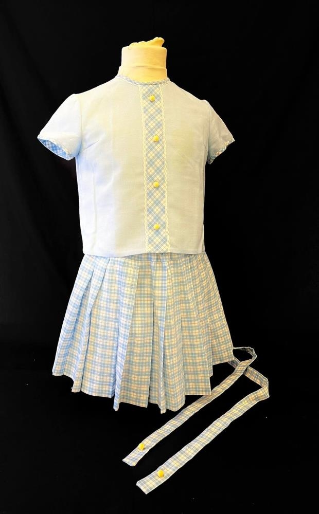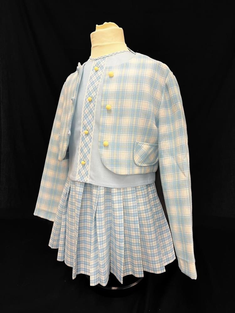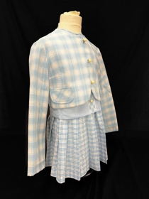 Pils, blússa og jakki á barn. Blá- og hvítköflótt plíserað pils með rennilás að aftan. Blá blússa með sama bláköflótta mynstri fyrir miðju að framan. 4 hvít/gulir plast hnappar til skrauts. Jakki með sömu plasttölum til að hneppa saman. Blá- og hvítköflótt munstur, stærra en á pilsinu en sambærilegt. Litlir vasar á jakka.