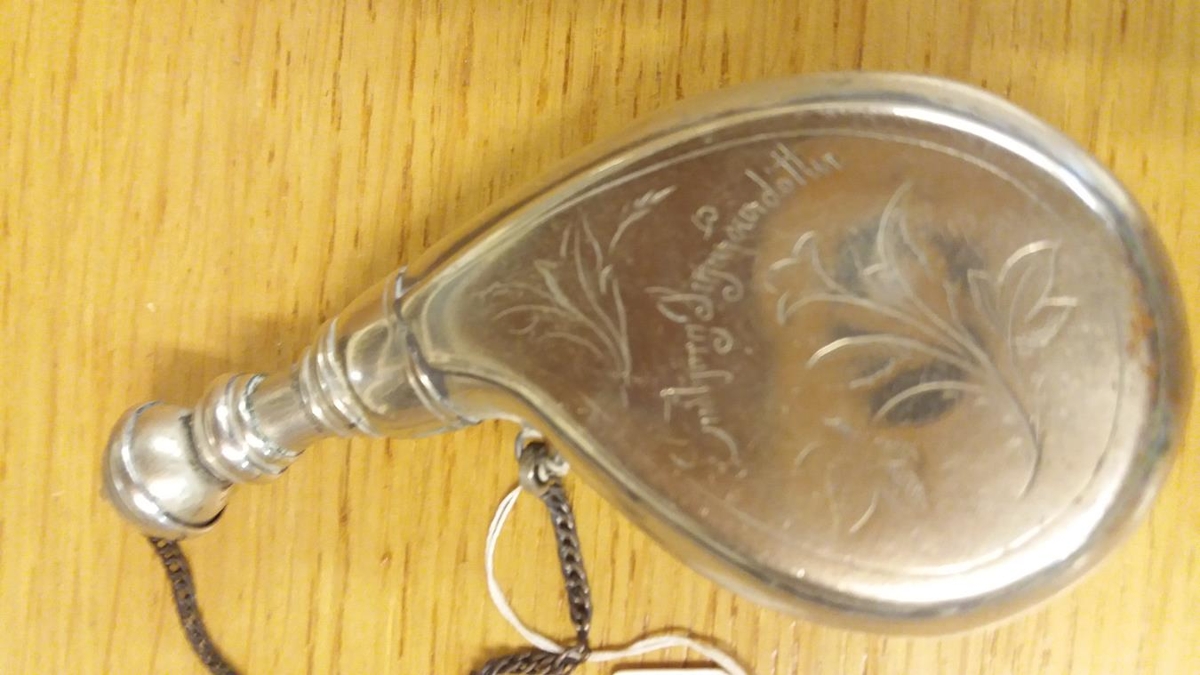 Tóbaksbaukur Guðbjargar á Butru, smíðaður úr nýsilfri. Á hann er grafið Guðbjörg Sigurðardóttir. Þetta er verk Guðmundar Viborg í Reykjavík.