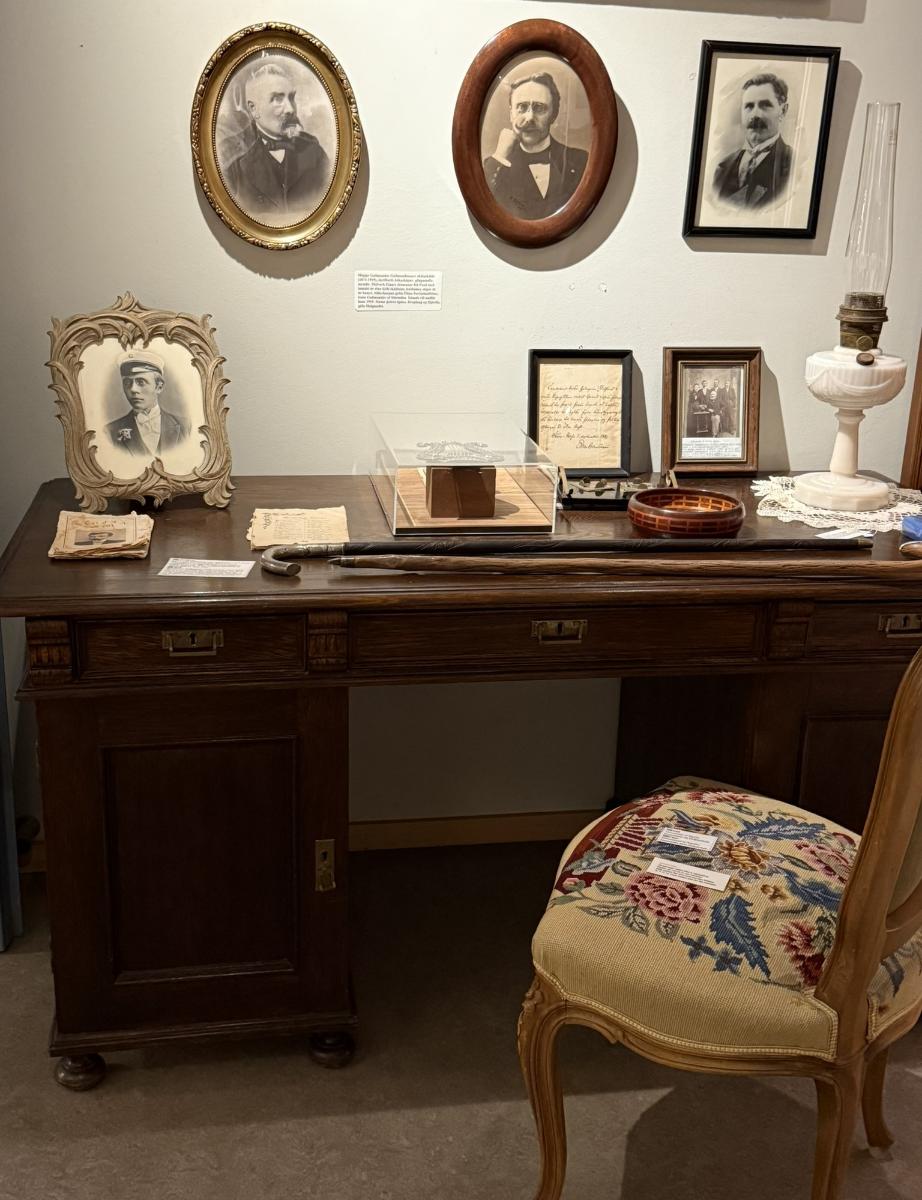 Skrifborð skáldsins. Þetta er mikið og vandað eikarskrifborð, hæð 76 cm, lausastólpar eru undirstaða borðplötu og standa á renndum hnúðum. Þrjár skúffur eru í borðplötu. Þær systur vita ekki um smið.