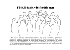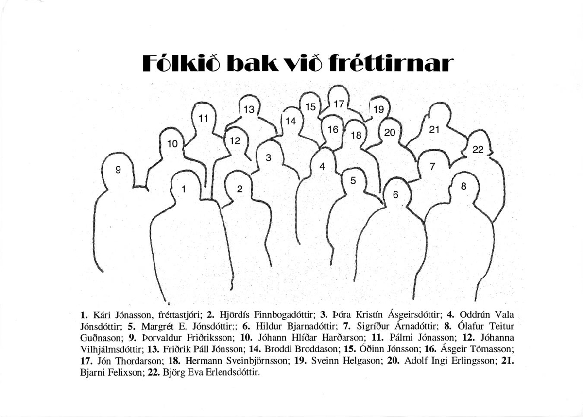 Starfsmenn fréttastofu útvarpsins samankomnir á Markúsartorginu í Útvarpshúsinu við Efstaleiti. Nánari nafngreining sjá Skjal 1 undir Fylgiskjöl.