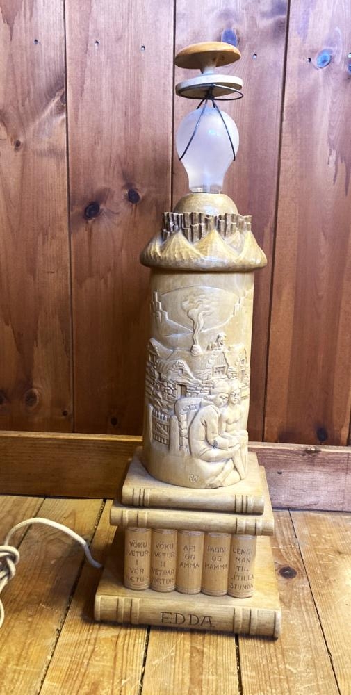 Skrifborðslampi, útskorinn, verk Ríkarðs Jónssonar.Gefið af erfingjum Eyjólfs Guðmundsson rithöfundar á Hvoli í Mýrdal, gefinn honum á 80 ára afmæli 31. ágúst 1950 af Dyrhólahreppsbúum.