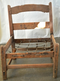 Hefur einhverntíma verið yfirdekktur og er með fjölda ryðgaðra nagla. Brotið neðan af einum stuðli (oka) og annar bakstuðull tvíbrotinn. Helmingur af setufjölum brottu. Hefur áður verið með snærissetu. Sessa klædd salúnsvefnaði fylgir.