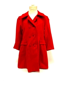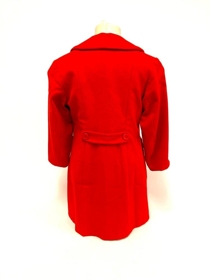 Barnakápa úr rauðu ullarefni, fóðruð með vösum og fjórum tvíhnepptum tölum og spæl að aftan. Tvær eins kápur af systrunum Astrid og Oddrúnu sjá einnig MSA2022-51
