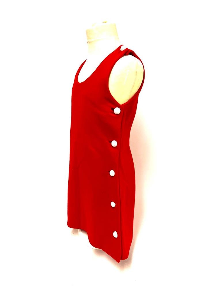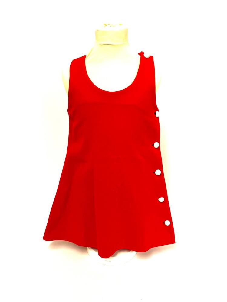 Ullarskokkur rauður með sex hvítum tölum, hnepptur á hliðinni. Ein tala efst öðrumegin í hálsmáli.
