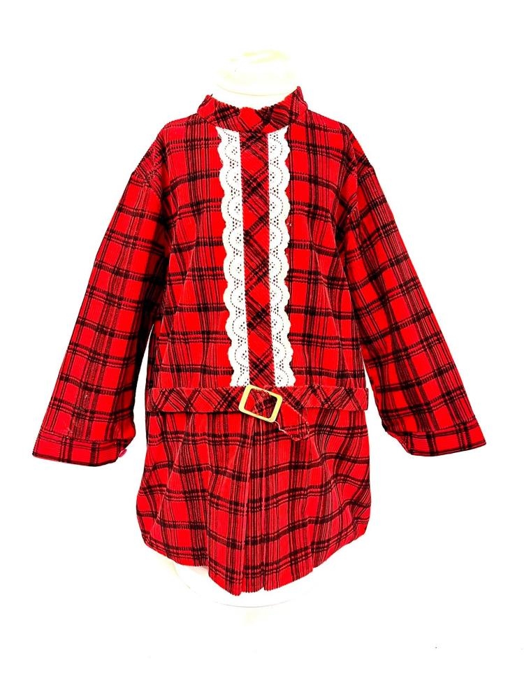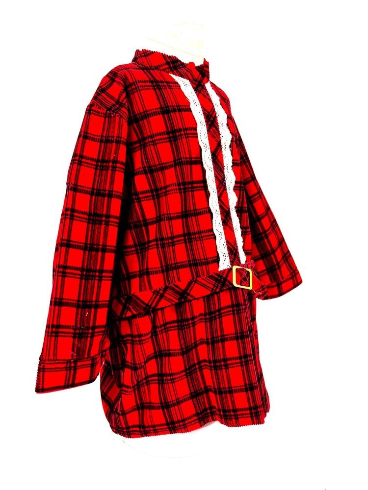 Kjóll á sjö ára stúlku. Jólakjóll. Úr svart/rauðköflóttu flaueli. Með sylgju í mittinu og hvítri blúndu framan á brjóstsaumi og þrjár látúnstölur efst í hálsmáli.
