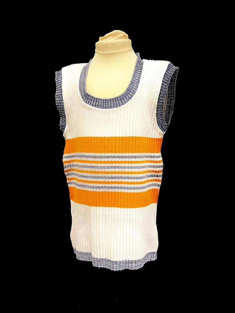 Vesti á stúlku úr bómull. Hvítt með appelsínugulum og bláum röndum. Háls- og ermalíning í bláu. Keypt í Noregi.