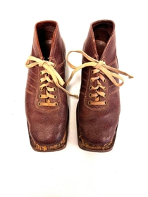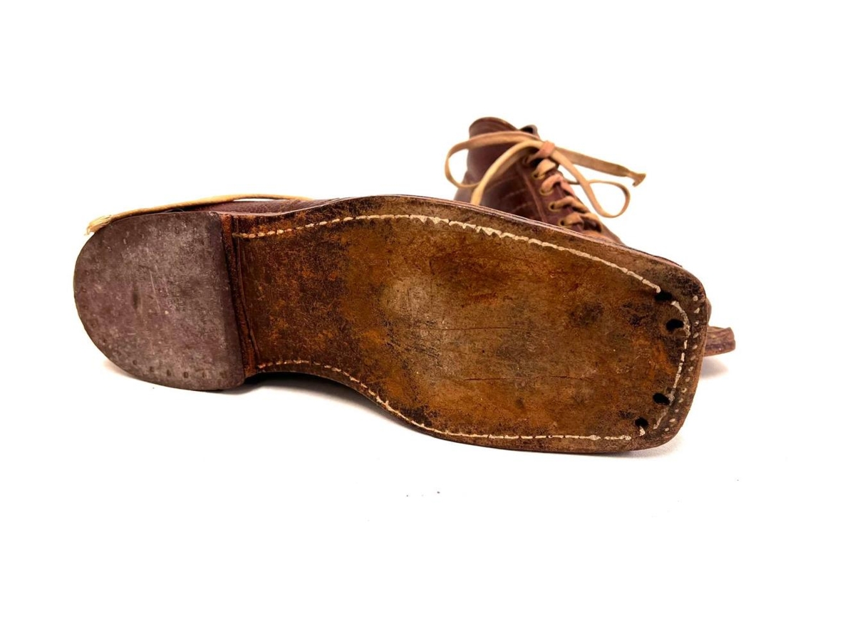 Ljósbrúnir skíðaskór með dröppuðum reimum.