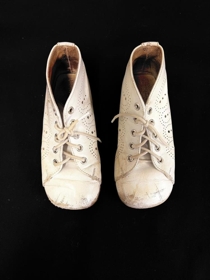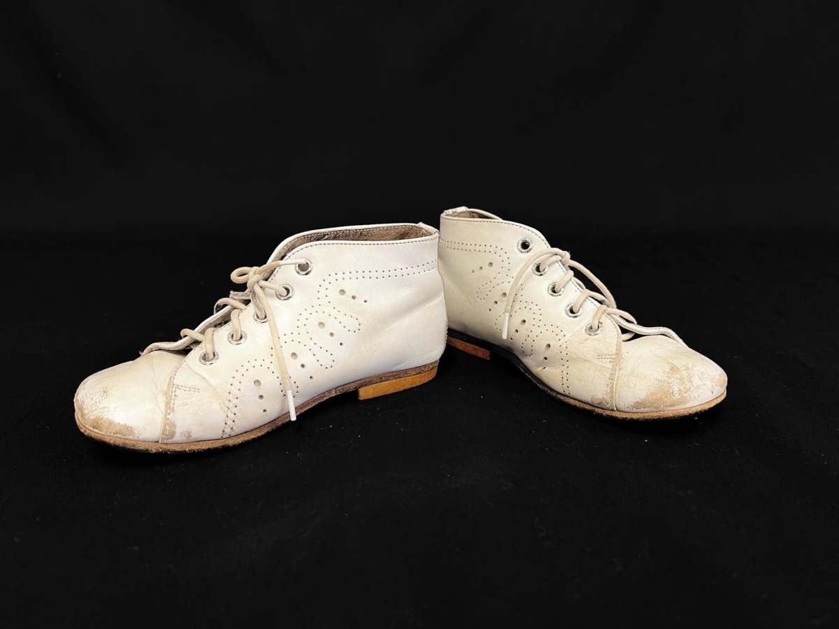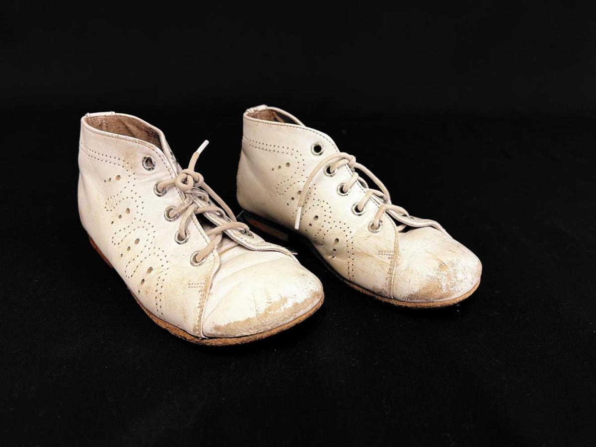 Barnaskór, hvítir líklega úr leðri. Reimaðir og munstur í leðrinu.