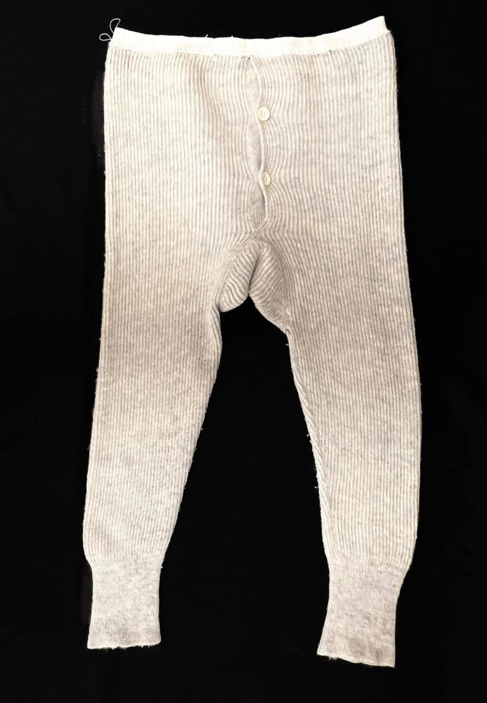 Föðurland. Síðar ullarbuxur. Blágráar með hvítum tölum og teygju í mittið. Prjónuð af langaömmu gefenda, Halldóru Þorsteinsdóttur. Halldóra og maður hennar Magnús Sölvason bjuggu fyrst í Brimnesi, Ólafsfirði en byggðu sér síðan hús í Horninu í Ólafsfirði sem þau nefndu Lyngholt. Þau voru foreldrar Margrétar Magnúsdóttur sem giftist Ágústi Jónssyni, föður Magnúsar Ágústssonar.