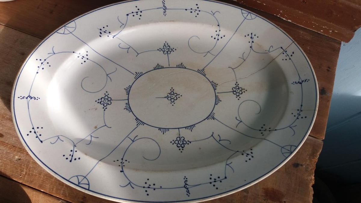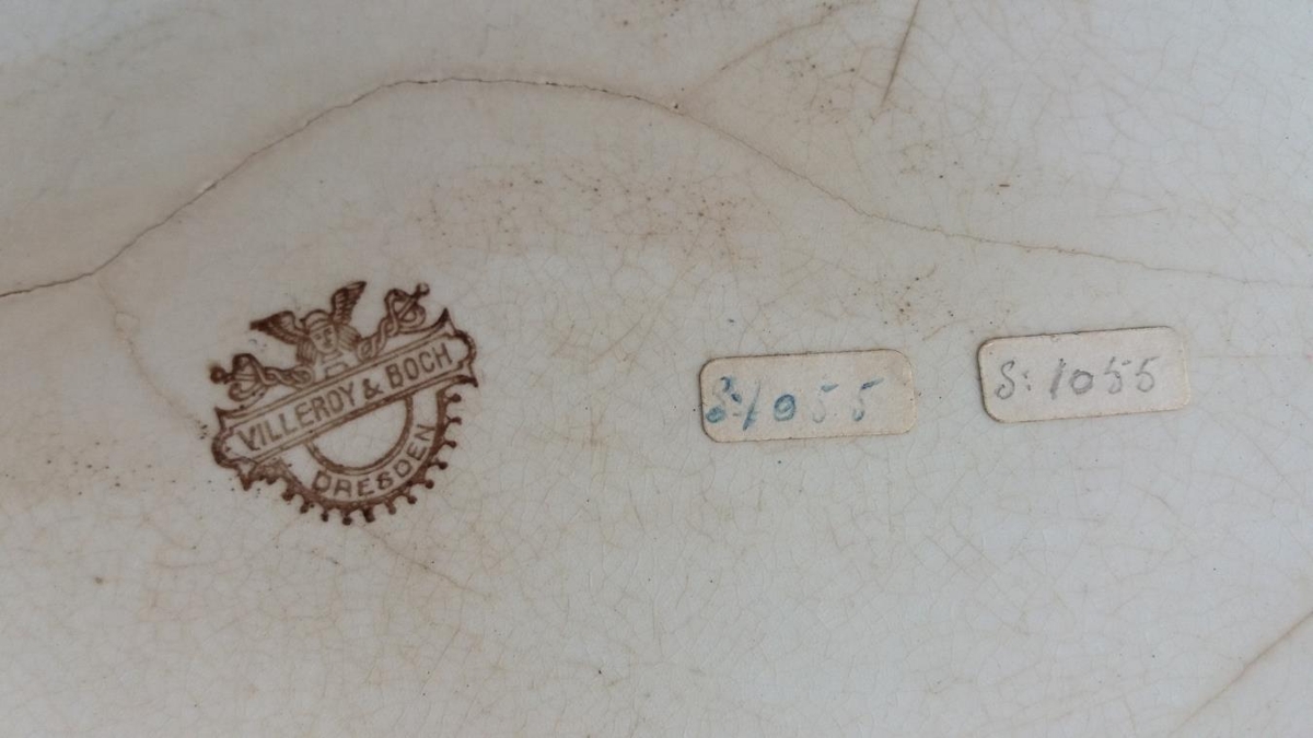 Frá frú Kristínu Einarsdóttur í Presthúsum í Mýrdal: Stórt, ílangt leirfat (fiskfat), brostið og sprungið. Leirinn er hvítur en skreyttur bláum rósum og öðru flúri. Merking: Villeroy & Boch. Dresden. Sigríði Brynjólfsdóttur á Reyni var sent fatið af Þorgeiri Magnússyni í Vestmannaeyjum um 1906.