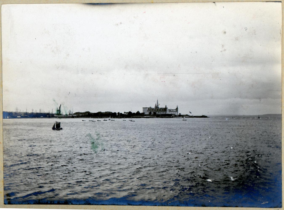Seglskip og nokkrir minni bátar á legu utanvið strönd, fjær stendur kastali út við ströndina.
