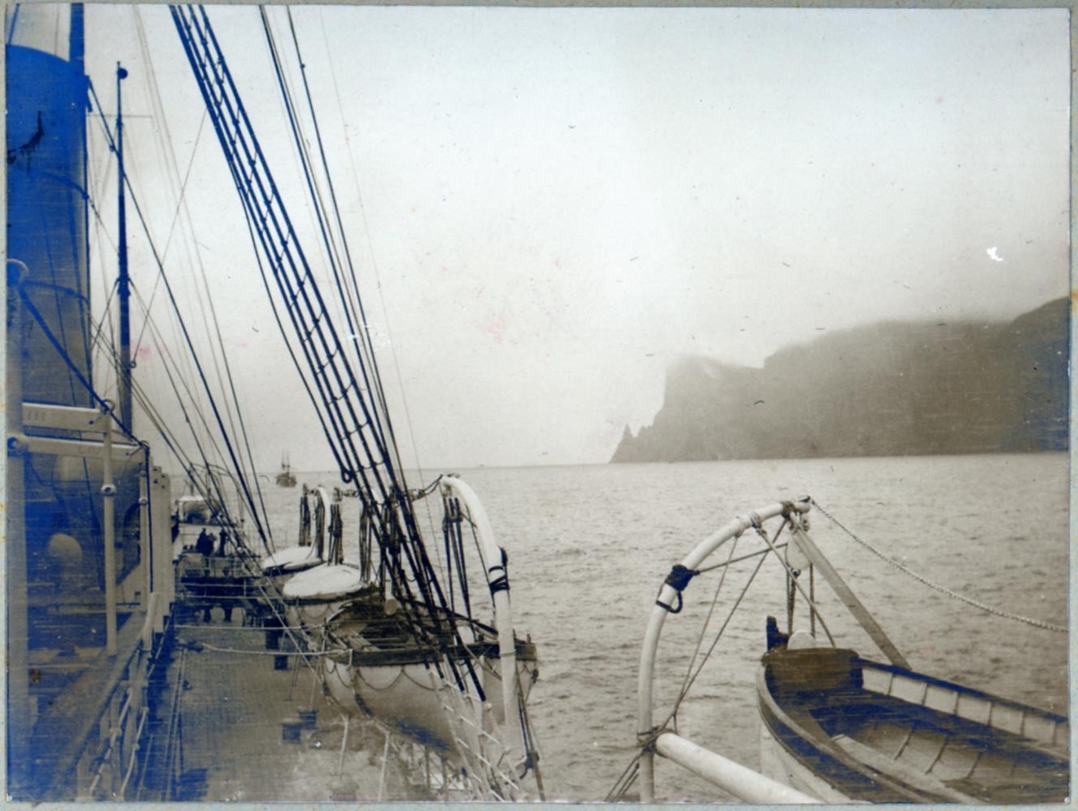 Þilfar og björgunarbátur í forgruni, sjávarklettur í baksýn t.h.