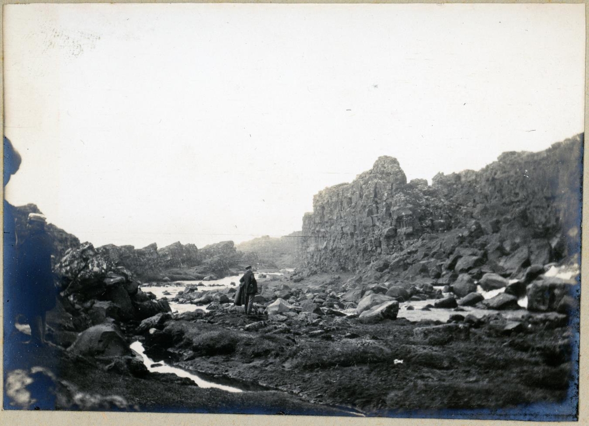 Almannagjá, Öxarárfoss rétt utan myndar t.h. Gæti verið að þarna sé Friðrik konungur að virða fossinn fyrir sér.