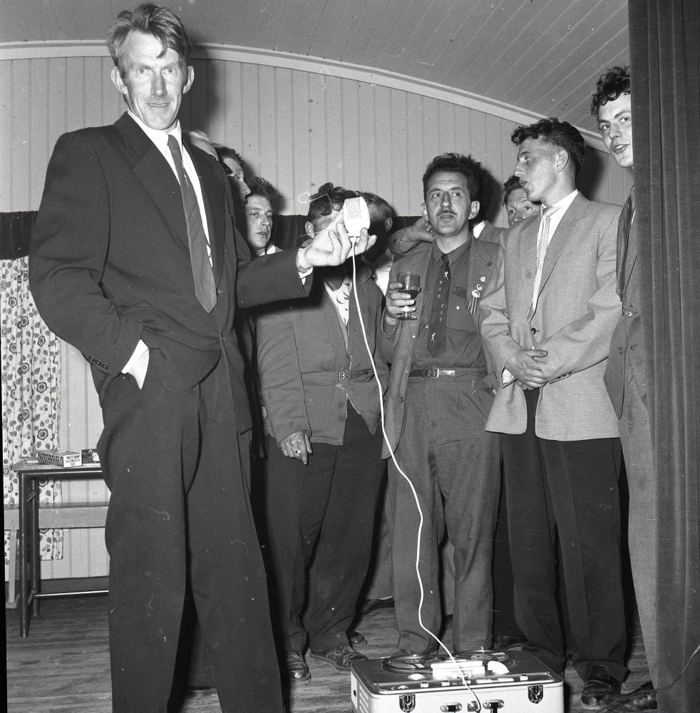Vigfús Baldvinsson er hér að taka upp á segulbandtæki sem Magnús fékk í afmælisgjöf. Tækið er enn til og fylgdi því ein 7" spóla þar sem heyra má þessa upptöku frá 2. júní 1958. Þar má heyra fjöldasöng sem hér sést hljóðritaður og er Guðmundur Ingvarsson sérstaklega nefndur sem einsöngvari. Einnig er þess getið að ljósmyndari (Lalli Magg.) sé stöðugt að taka myndir af fólkinu.