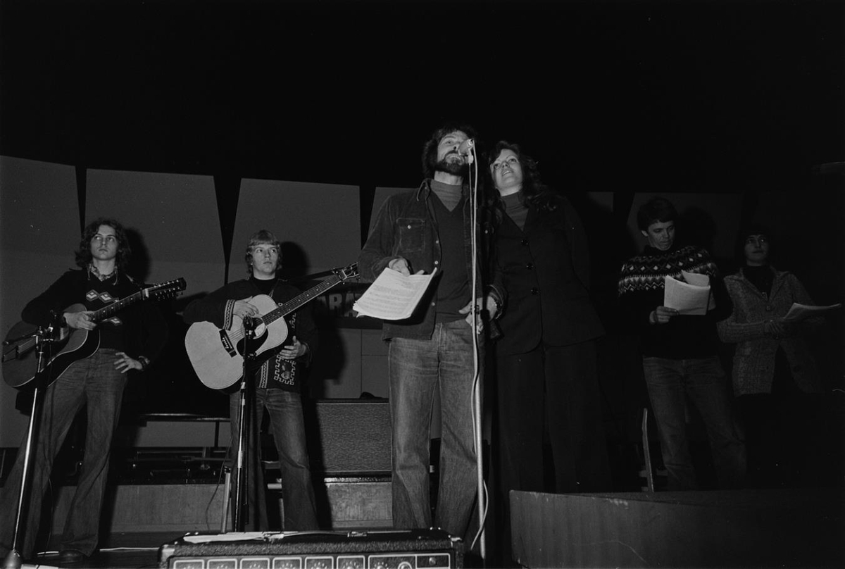 Leikhópurinn Alþýðuleikhúsið. Fólk stendur á sviði í Háskólabíó. Tveir karlmenn halda á gítar, tvö standa í miðjunni við hljóðnema og til hægri er kona og karlmaður í lopapeysu. Frá v. Óþekktur, óþekktur, Þráinn Karlsson, María Árnadóttir, Arnar Jónsson og Kristín Ágústa Ólafsdóttir.