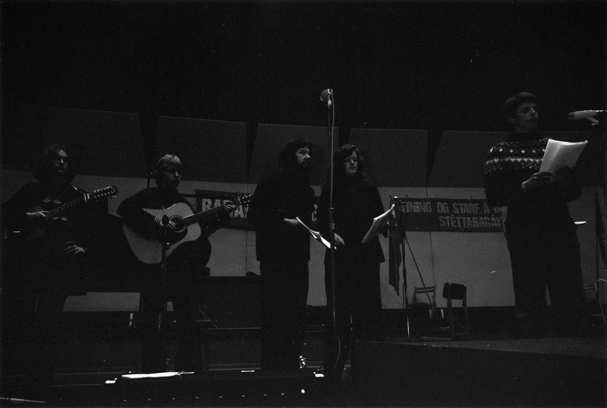 Leikhópurinn Alþýðuleikhúsið. Fólk stendur á sviði í Háskólabíó. Tveir karlmenn halda á gítar, tvö standa í miðjunni við hljóðnema og til hægri er karlmaður í lopapeysu. Frá v. Óþekktur, óþekktur, Þráinn Karlsson, María Árnadóttir og Arnar Jónsson.