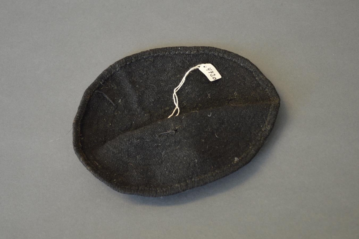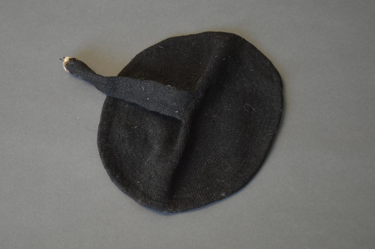 Skotthúfa, prjónuð af Arnlaugu Tómasdóttur úr svörtum togþræði, skúflaus.