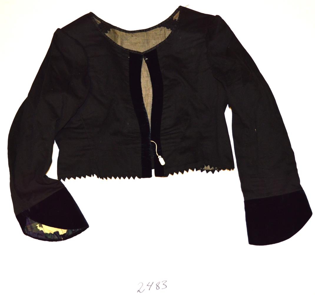 Stakkpeysa Ólafar Jónsdóttur í Vallnatúni u. Eyjafjöllum, ( f.1879, d. 1963 ), ásamt slifsi hennar, kögruðum silkiborða. Peysan er saumuð úr klæði.