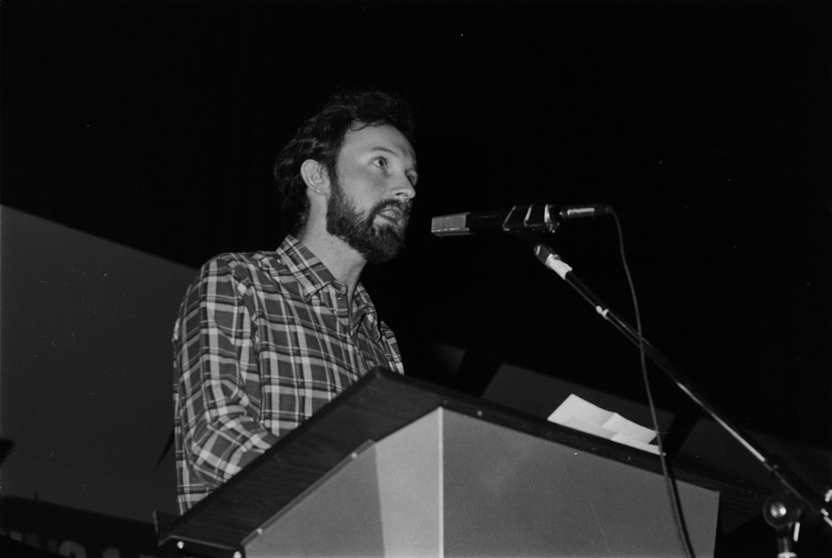 Fundur á vegum Baráttueiningar í Háskólabíói þann 1. maí 1976. Karlmaður stendur við ræðupúlt og heldur ræðu, hann er með skegg og er klæddur köflóttri skyrtu. Myndin er dimm. Sigurður Jón Ólafsson verkamaður.