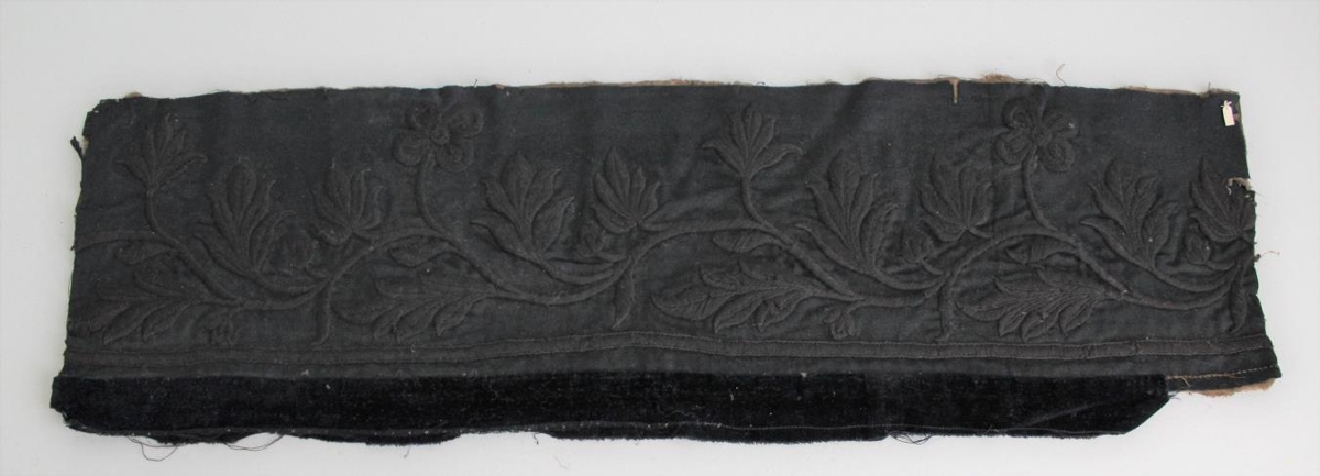 Svartur klæðisbútur, skatteraður. Frá samfellu Þuríðar Þórðardóttur í Árkvörn og mun saumað af henni. Stærð 72 x 19 cm.