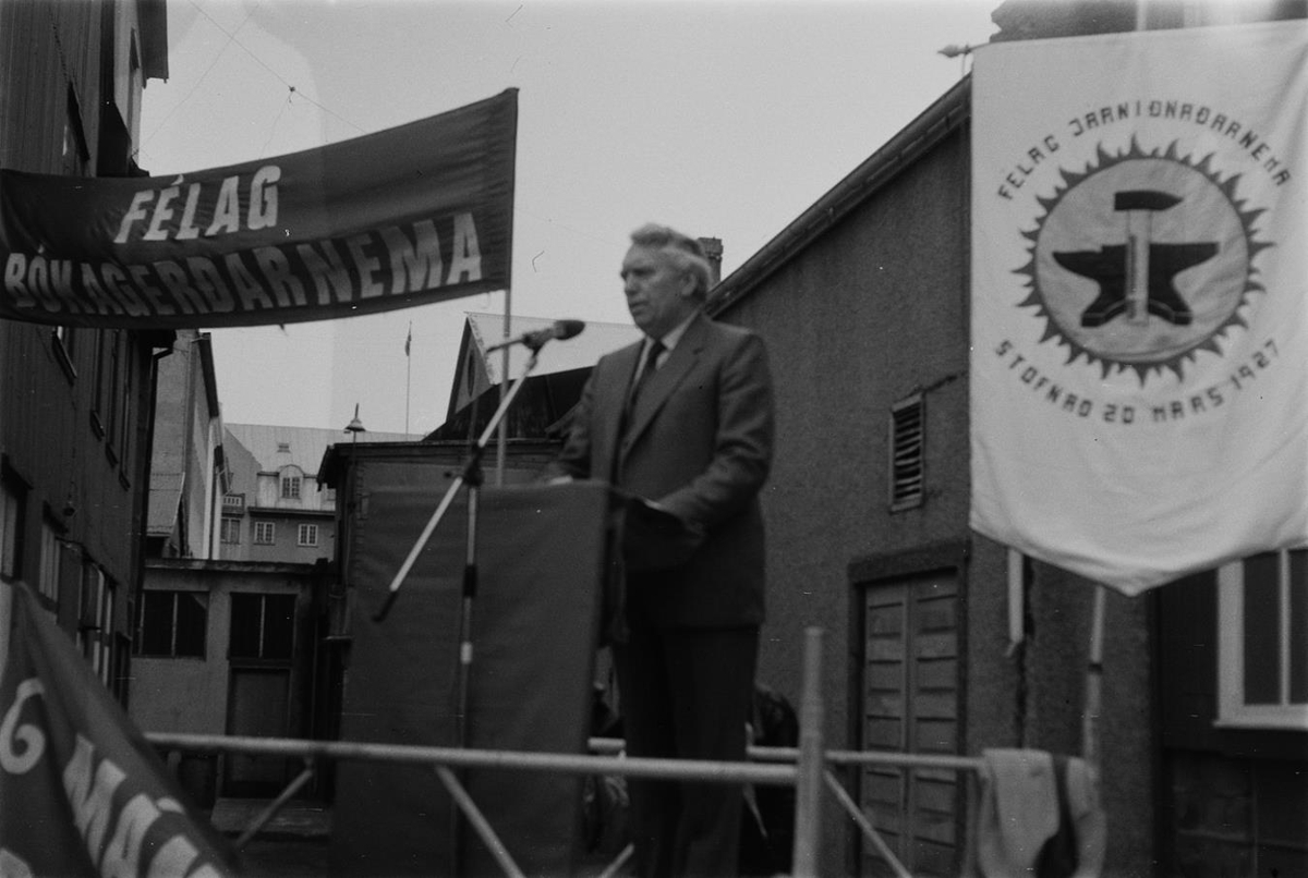 Útifundur. Sennilega 1. maí 1981. Félag bókagerðarnema og Félag járniðnaðarnema standa fyrir útifundi á Hótel-Íslandsplaninu/Hallærisplaninu. Karlmaður í jakkafötum stendur við ræðupúlt og flytur ræðu. Sennilega Pétur Pétursson, útvarpsmaður.