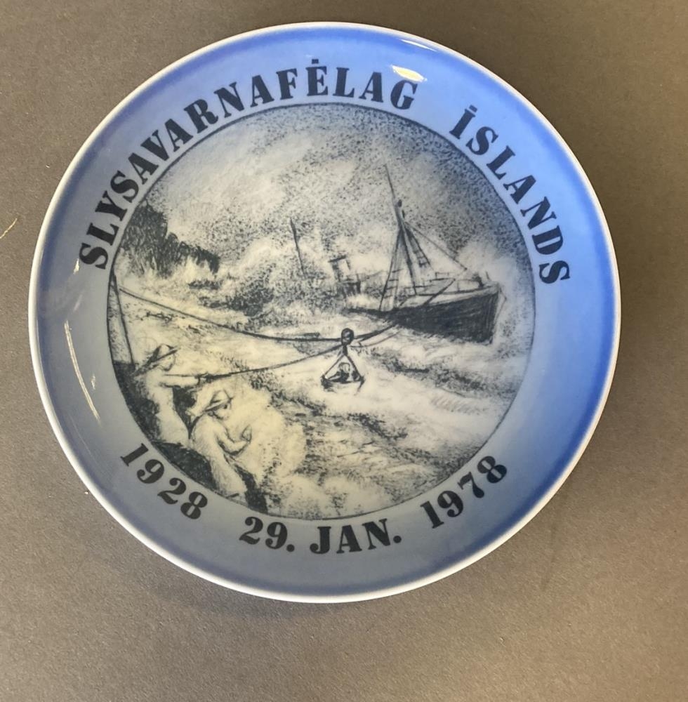 Minningarsjöldur Slysavarnafélags Íslands 1928, 29. jan 1978. Á bakhlið er stimpill B&G 8557/619 "Made exclusively for The national life-saving Association of Iceland, on the occasion of the 50th anniversary. Einnig merki hönnuðarins, "Eggert". Úr dánarbúi Sveinbjargar Ásmundsdóttur og Guðmundar Erasmussonar á Syðri-Fljótum.