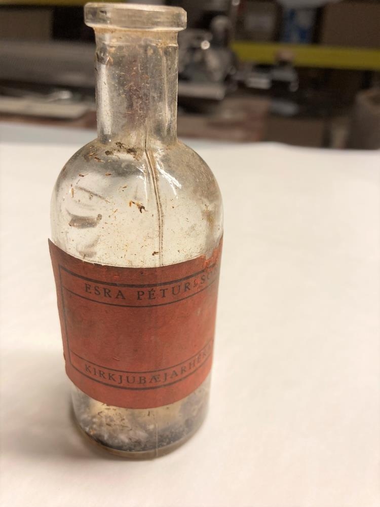 Meðalaglas, merkt Esra Péturssyni lækni á Kirkjubæjarklaustri. Úr búi Sveinbjargar Ásmundsdóttur og Guðmundar Erasmussonar á Syðri-Fljótum.