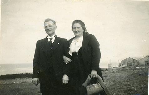 Halldór Þorsteinsson frá Vörum í Garði og systir hans, Guðrún Þorsteinsdóttir. Þau eru þarna stödd í hlaðinu í Vörum og í baksýn má sjá fiskhúsin í Vörum.