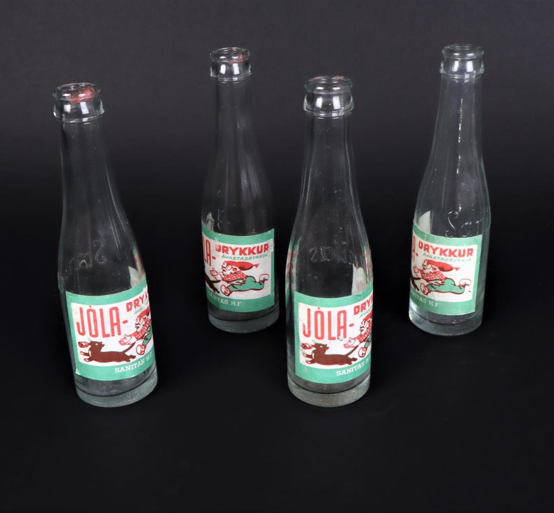 Gosflaska undan Jóla-drykk, ávaxtadrykk, framleitt af SANITAS. Áletrun: "JÓLA-DRYKKUR ÁVAXTADRYKKUR SANITAS H.F." Á glerflöskunni, sem er glær, má sjá orðið Sanitas með upphleyptum stöfum. Merkimiðinn er hvítur í grunninn með grænum ramma. Þar er ofangreind áletrun með rauðum, grænum og hvítum stöfum en einnig má sjá jólasvein elta kött sem hefur flösku í kjaftinum.