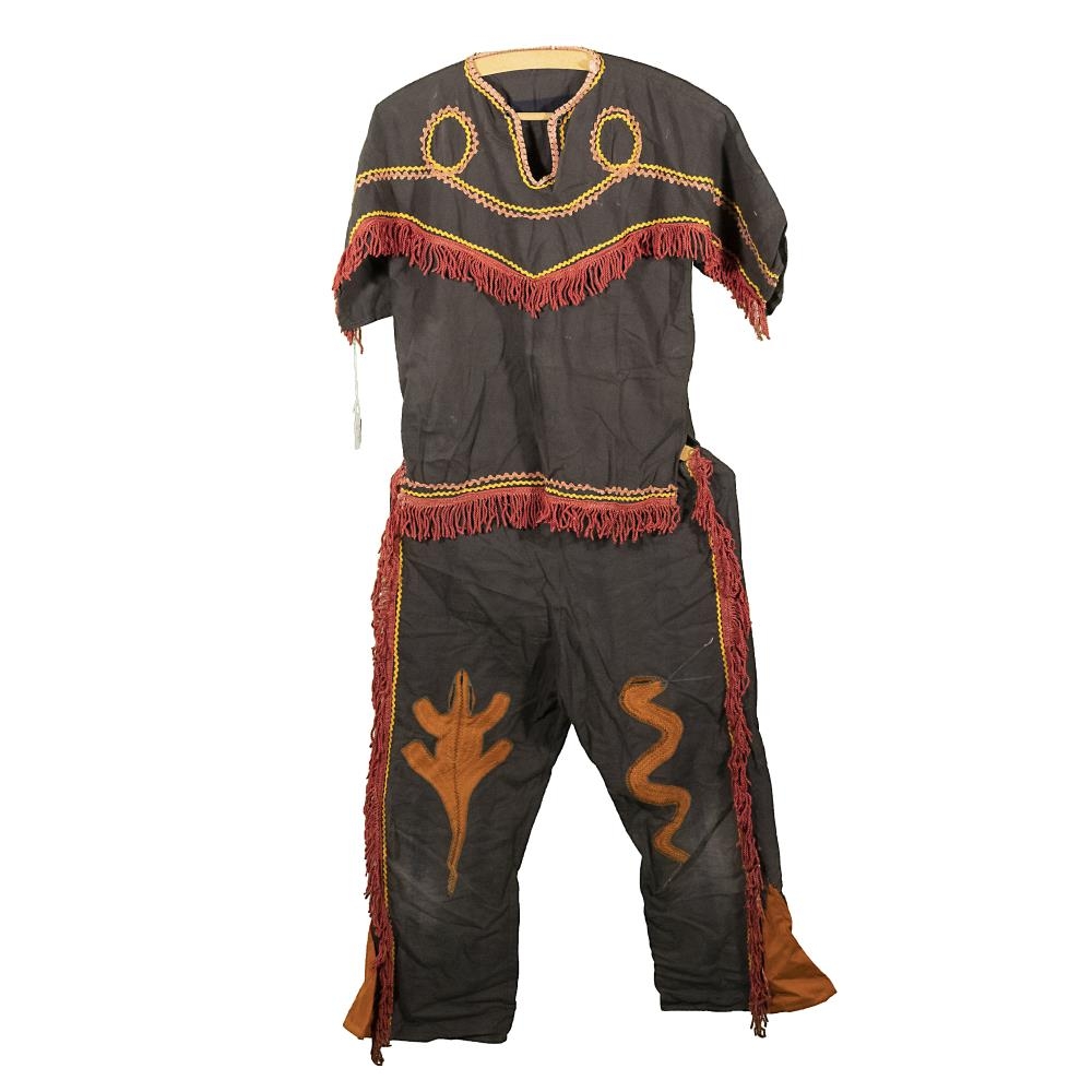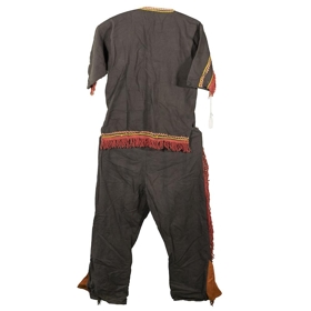 Buxur og treyja dökkbrún að lit og er með rauðleitu kögri og gulum og bleiklituðum bryddingum. Einnig er ísaumað í buxur appelsínugular myndir af snák og skriðdýri.