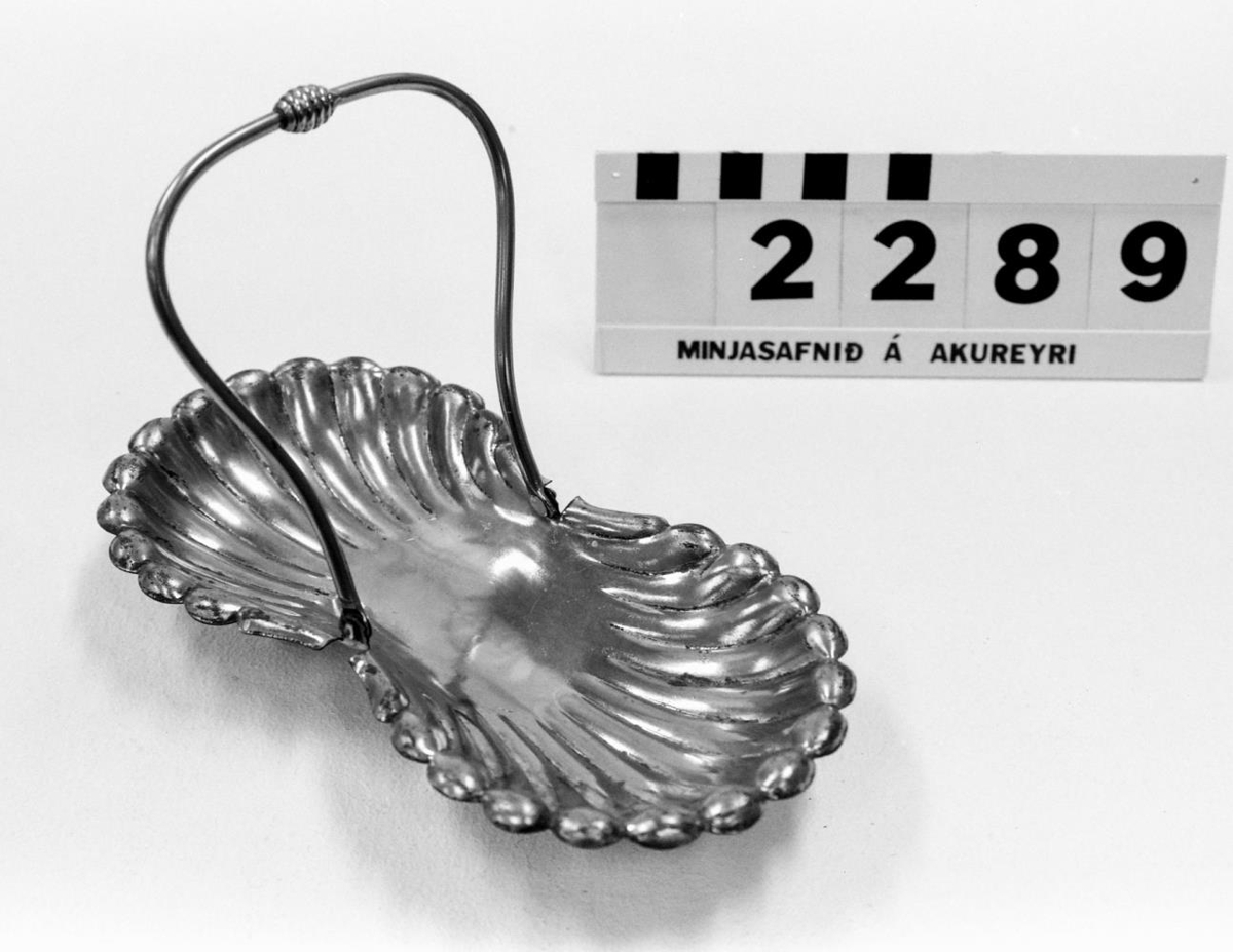 má niður. Bakkinn lítur út eins og tveir hörpudiskar. Á handfangi