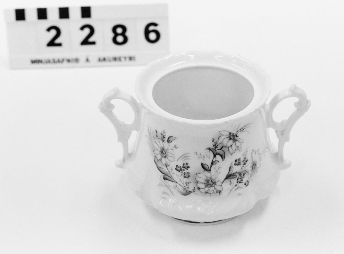 Það er með tveimur eyrum en lok vantar. Þvermál efst 8,5 sm. en víkkar