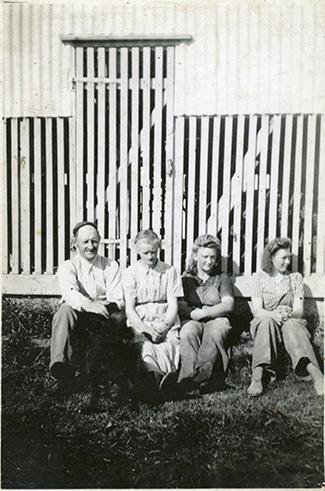 Við þurrkhjallinn í Akurhúsum í Garði. Frá vinstri: Þorlákur Benediktsson kaupmaður í Akurhúsum, kona hans Jórunn Ólafsdóttir, Sveinbjörg Hansdóttir frá Bárugerði í Sandgerði og Egilína Guðmundsdóttir frá Skuld í Garði.