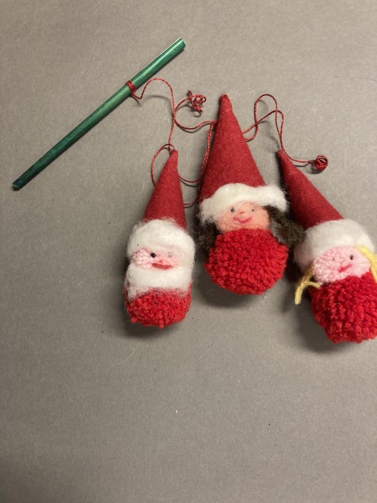 Jólaórói. 3 jólasveinar gerðir úr dúskum með rauðar filthúfur. Hanga í rauðum spotta á grænum trésívalningi.